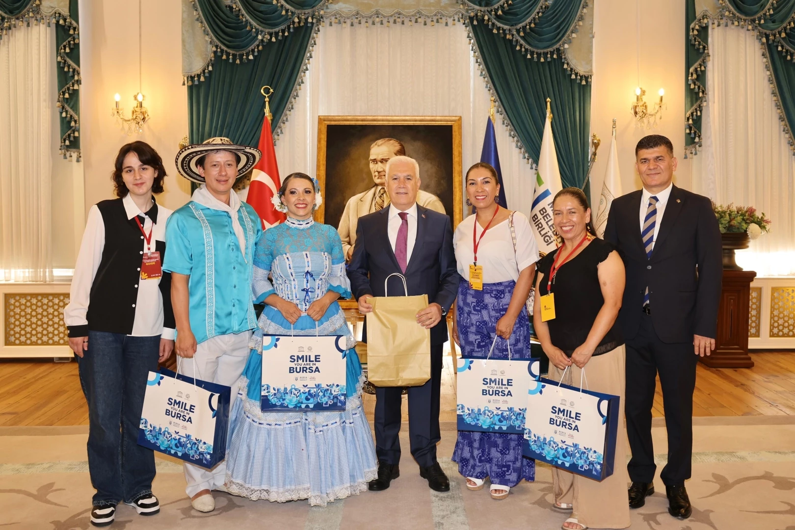 BURSA (İGFA) - Bursa Büyükşehir Belediyesi adına Bursa Kültür Sanat ve Turizm Vakfı (BKSTV) tarafından düzenlenen 37. Uluslararası Altın Karagöz Halk Dansları Yarışması'na katılan ülkelerin temsilcileri ve yarışmanın jüri üyeleri, Bursa Büyükşehir Belediye Başkanı Mustafa Bozbey’i Tarihi Belediye Binası’nda ziyaret etti.