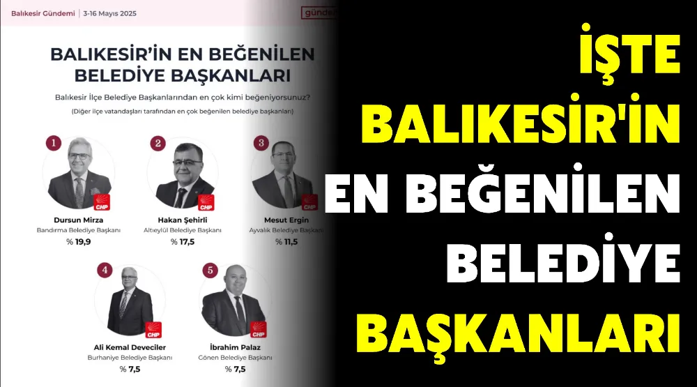 Sındırgı Belediye Başkanı Serkan Sak ve Susurluk Belediye Başkanı Hakan Semizel "kendi ilçesinde en çok beğenilen belediye başkanları" olarak öne çıktı. Karesi Belediye Başkanı Mesut Akbıyık ise kendi ilçesinde en çok beğenilen belediye başkanları arasında sonuncu sırada yer aldı..